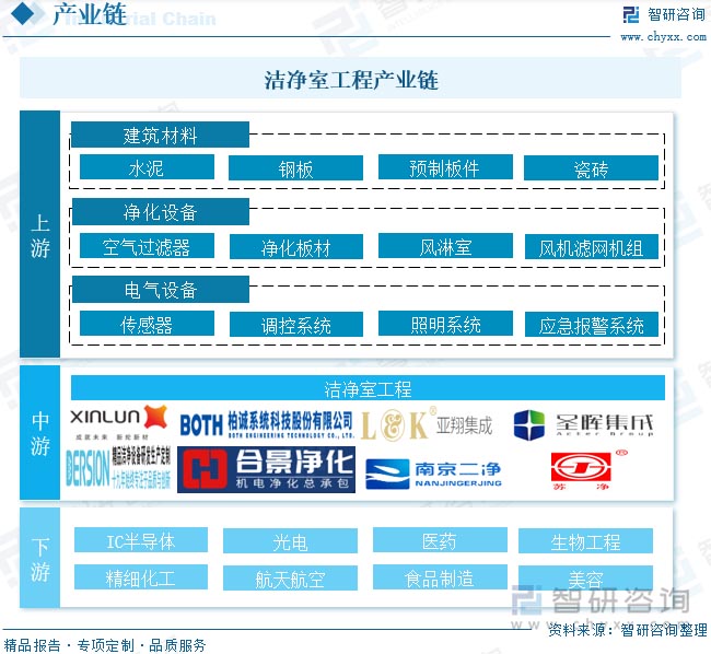 经过几十年的发展,我国洁净室工程产业链已逐步形成。上游包括水泥、钢板、预制板件、瓷砖、门窗等建筑材料,空气过滤器、净化板材、风淋室等净化设备,以及传感器、监控器、调控系统、照明系统、应急报警系统等电气设备。产业链中游包括洁净室设计、工程施工、调试、运行等环节。洁净室工程是一个应用行业非常广泛的基础性配套产业,目前在IC半导体、光电、医药、生物工程、精细化工、航天航空、食品制造等众多行业均有应用,并根据行业的精密与洁净要求,等级差别也较大,级别最高的当属航空仓,属于特殊领域,面积相对较小;另外对级别要求较高的是生化实验室和高精纳米材料生产车间。下游产业在中国的快速发展及其生产环境标准的逐步提高,将直接带动洁净室行业持续向好发展。