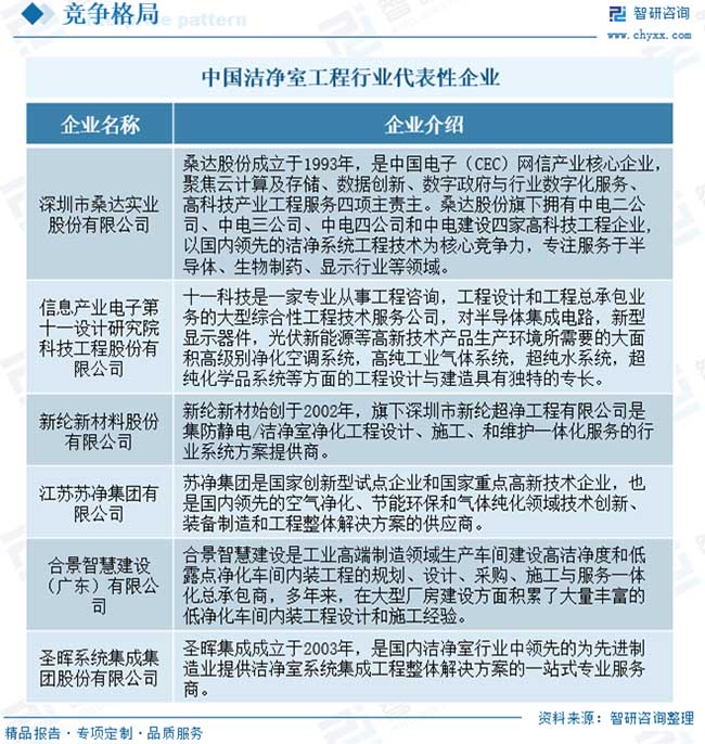 超洁净环境控制又融合了风险评估、生产认证的概念和程序,加之洁净技术跨行业、跨专业、跨学科的特点,使得洁净室工程的难度和复杂性增加。因此对于洁净室工程行业来说,优化设计、现场施工环境的协调与管控、工程相关技术细节的经验积累,对客户需求的理解和实现,以及对设计变更的准备和响应程度等都是衡量洁净室工程企业竞争能力的重要指标。?目前,我国洁净室工程行业竞争较为激烈,企业数量较多。其中,桑达股份、十一科技、苏净集团、新纶新材、柏诚股份、亚翔集成等设计研究院或建设承包企业在降低建造成本、提高洁净室的稳定性等方面占据优势,能提供高端洁净室系统集成解决方案,位居行业领先地位。同时,行业内还存在大量规模较小、技术水平与综合解决方案能力有限的洁净室工程企业,普遍集中在对洁净等级要求不高的低端市场。