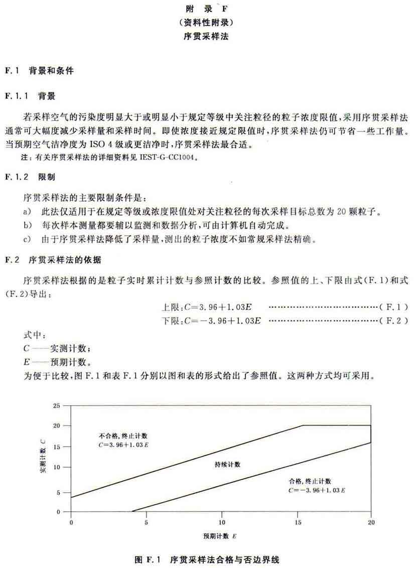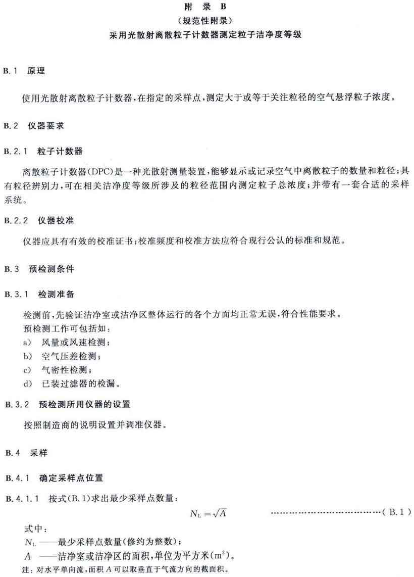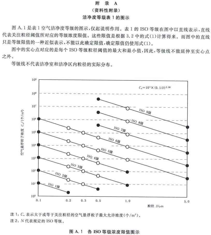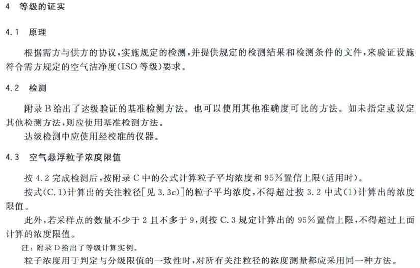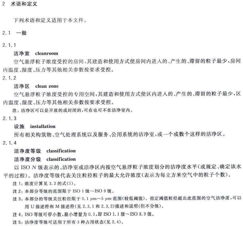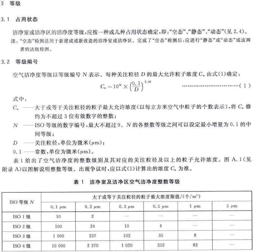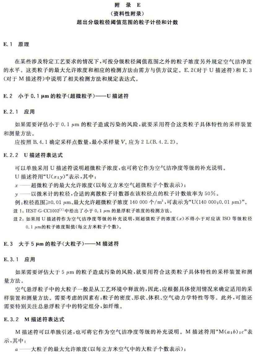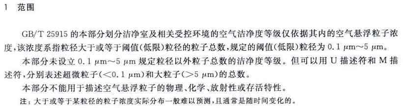 GB/T25915的本部分划分洁净室及相关受控环境的空气洁净度等级仅依据其内的空气悬浮粒子浓度,该浓度系指粒径大于或扥估阈值(低限)粒径为0.1μm~5μm规定粒径以外粒子总数的洁净度等级。但可以用U描述符合M描述符,分别表述超微粒子(<0.1μm)和大粒子(>5μm)的总数。