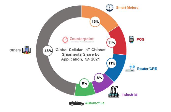 在蜂窝物联网芯片中,当前应用规模最大的是低速率的NB-IoT芯片(占比60%),NB-IoT也是我国主推的物联网连接方式,应用在智能仪器表盘、资产追踪等场景。其次是中速率的2G/3G(占比30%),用于移动支付、智能穿戴和智能家居中。4G Cat.1和5G大约占比10%, 5G模组的成本过高,加上大部分物联网终端对传输速率的需求性不高,5G在物联网终端的应用占比较低,主要是自动驾驶和视频监控领域,但随着2G/3G转网,Cat.1在智能支付、定位追踪、车载终端、视频监控领域的高速增长,正逐渐打破蜂窝物联网6:3:1的格局。从应用场景来看,智能表计、POS支付、路由器/CPE、工业、汽车是蜂窝物联网芯片应用最广泛的前五大场景。