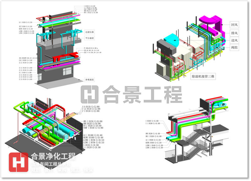BIM 技术可应用于工程项目规划、设计、施工、改建、运维等范围,为产业链贯通、工业化建造和建筑创作提供技术保障。合景智慧建设(广东)有限公司在洁净厂房工程建设中,以BIM技术为全周期模拟,对工程全局,即洁净环境、人流物流、暖通、电气工程、整厂能耗、质量、安全等方面提供方案优化和科学决策提供依据,与各专业协同工作、项目的虚拟建造和精细化管理,为工业洁净室建设提质增效、节能环保创造条件,虚实结合,赋能项目,打造交钥匙项目。